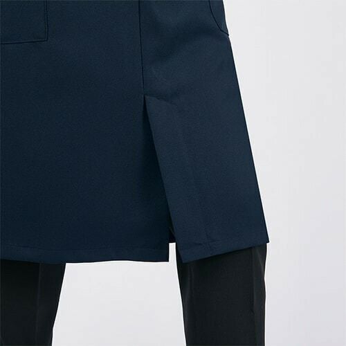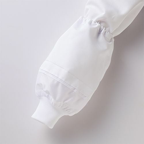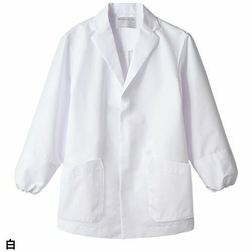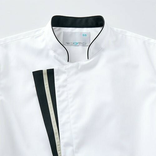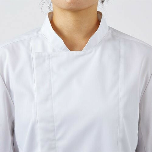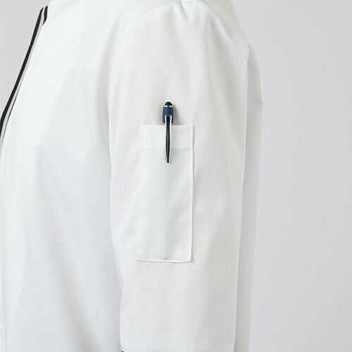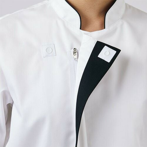 スマートなデザインに、動きやすさと衛生機能を忍ばせた白のコックコート。 七分袖の男女兼用コックコート。体毛の落下を防止する袖口ネット、コートからの異物落下を防止する腰ネット付き。左袖にペン差しポケット。動きやすさをサポートする背面プリーツ。破損しにくいスナップ・ファスナーで破損による異物落下を防止。襟裏に濃色を配色することで襟裏汚れの目立ちをカバー。生地の端を表に出さず、ほつれや糸くずの発生を抑制するパイピング仕様。