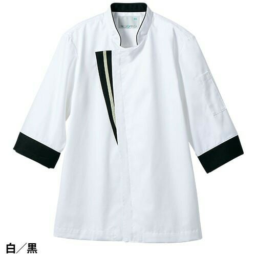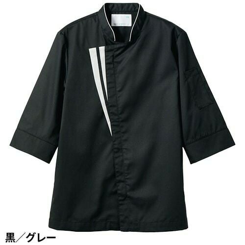 スマートなデザインに、動きやすさと衛生機能を忍ばせた黒/グレーのコックコート。 七分袖の男女兼用コックコート。体毛の落下を防止する袖口ネット付き。左袖にペン差しポケット。動きやすさをサポートする背面プリーツ。破損しにくいスナップ・ファスナーで破損による異物落下を防止。襟裏に濃色を配色することで襟裏汚れの目立ちをカバー。