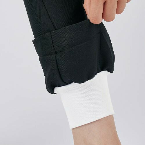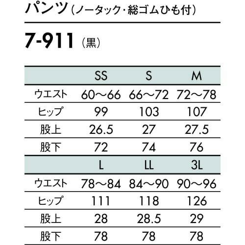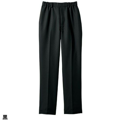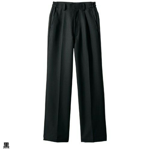 塩素消毒や工業洗濯にも耐えるタフな素材の黒のウエスト脇ゴムパンツ。 塩素消毒や工業洗濯に強いタフな素材を使用した男女兼用パンツ。適度なゆとりをもった自然なストレートライン。ワンタック・両脇ゴム。両腰ポケット、両後ろポケット付き。
