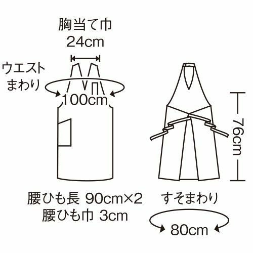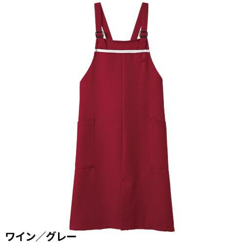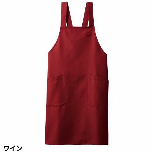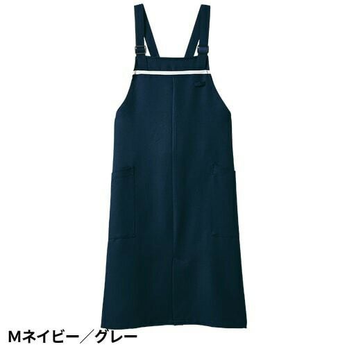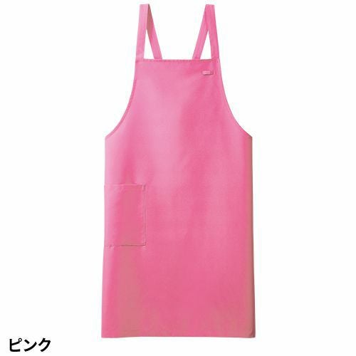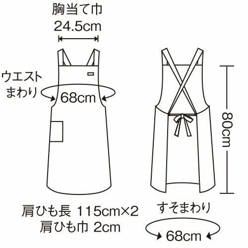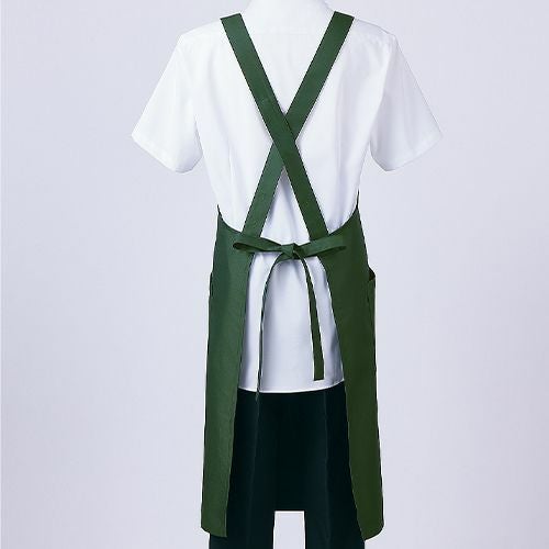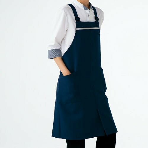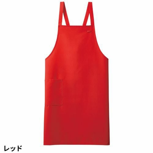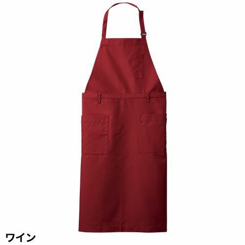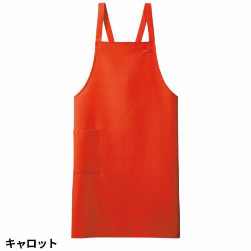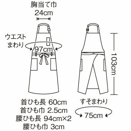 撥水撥油素材の胸当てエプロン。両腰ポケット付き。肩ひも3段と腰ひも調節で着用できるフリーサイズ。