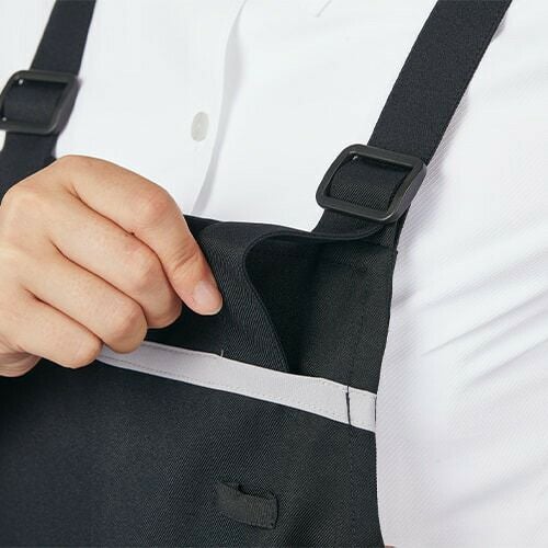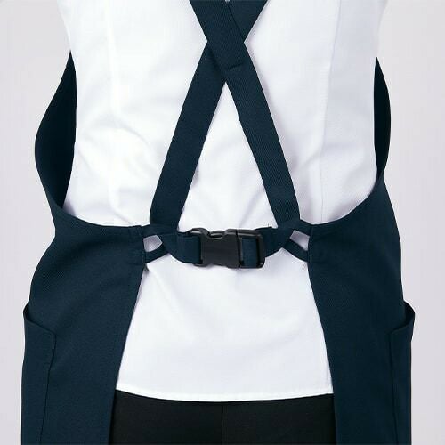 塩素消毒に強く、着用したままでのサイズ調整や着脱も簡単な黒のエプロン。 塩素消毒や工業洗濯に強いタフな素材を使用した胸当てエプロン。着用したまま、肩紐のアジャスターで肩紐・腰紐の長さが調整可能。ワンタッチ式バックルで着脱簡単。フロントのスリットで足さばきラクラク。両腰ポケット付き。
