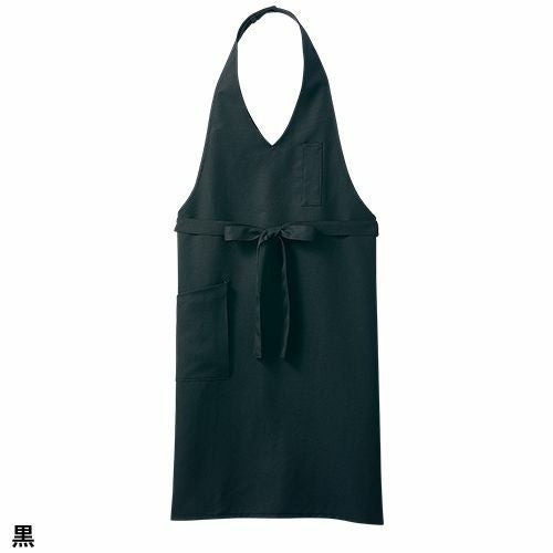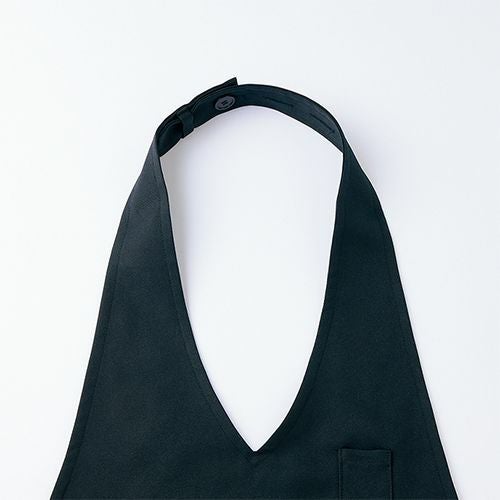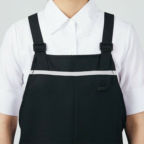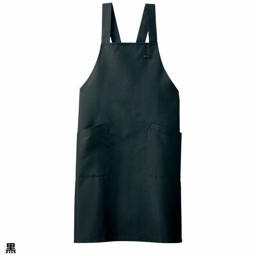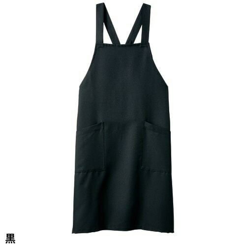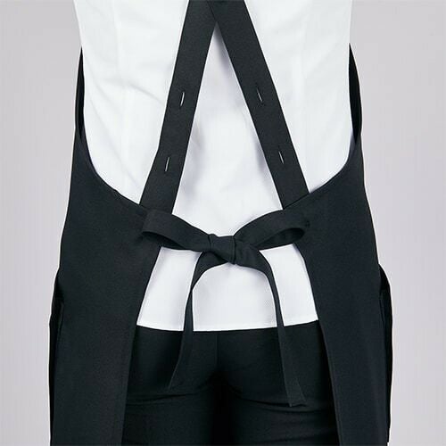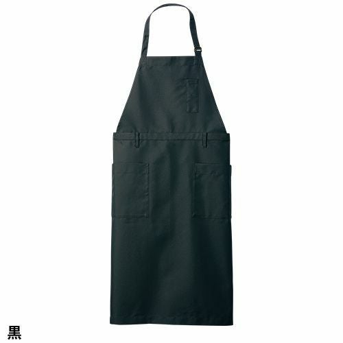 塩素消毒に強くきれいな発色が長持ちする黒の胸当て付きエプロン。 塩素消毒や工業洗濯に強いタフな素材を使用した胸当てエプロン。肩紐の長さはボタンで3段階に調節可能。両腰ポケット付き。