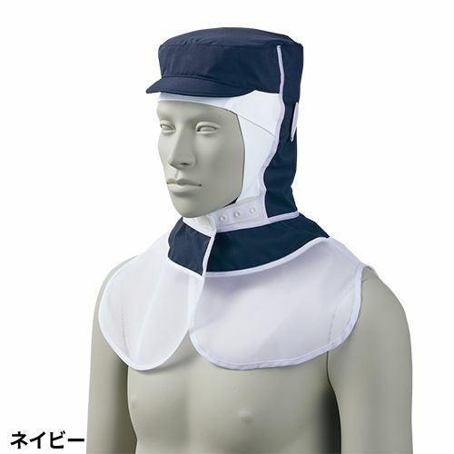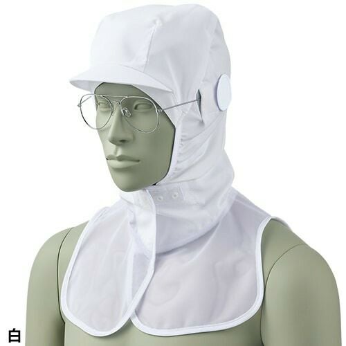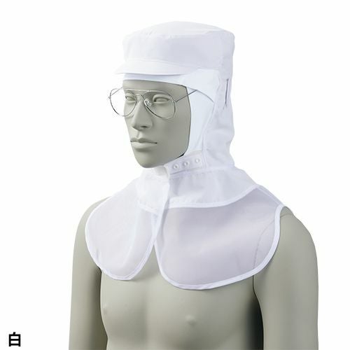 ストレスフリーな着用感と型崩れしにくいツバが魅力的な白の工場用頭巾帽子。 ケープ付きタイプ調節式の頭巾帽子(衛生キャップ)。後頭部と顔まわりに伸縮性のあるニット素材を使用。かぶり心地が良くタレ(毛髪落下防止ネット)を中に入れても突っ張らず長い髪もきれいに収まります。ツバ芯には形態安定性に優れたシリコン素材を採用することで型崩れを防止。メガネ差し、マスク留め、吸汗ニット付き。