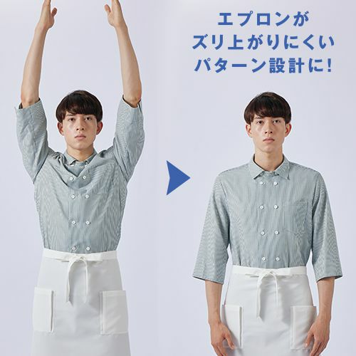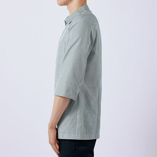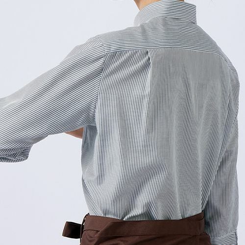 美しい立ち姿と動きやすさを両立させた7分袖のコックコート風ストライプシャツ。袖下のマチで腕まわりが動きやすい機能設計です。