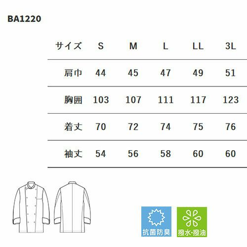 他の画像を見る セブンユニフォーム 業務用 厨房服 調理服 ナノコート 長袖 BA1220 コックコート キッチン スタッフ シェフ 制服 ユニフォーム 男女兼用 メンズ レディース 抗菌 防臭 撥水 おしゃれ 飲食店 厨房服 調理服 レストラン フレンチ イタリアン かっこいい ブランド 特別価格 ¥ 6,933 税込 最先端の技術を駆使したナノツイル加工! 最先端の技術を駆使した100万分の1mm単位の加工によって、細菌の増殖とそれに伴う悪臭の発生を強力に抑制。また、水性・油性の汚れも付きにくく、落としやすくなっています。こうした効果は、洗濯を繰り返しても衰えずに持続。素材の風合いを損なわず、ケアも従来以上に簡単な商品です。■高度な抗菌性&防臭性繊維上の細菌の増殖を抑制するため、極めて衛生的。細菌による、不快な悪臭も発生しません。■撥水性・撥油性も抜群水濡れや水性の汚れの繊維への付着を、徹底的に防止。また、油性の汚れが繊維に染み込みにくくなっています。 詳細を見る お気に入りに登録する