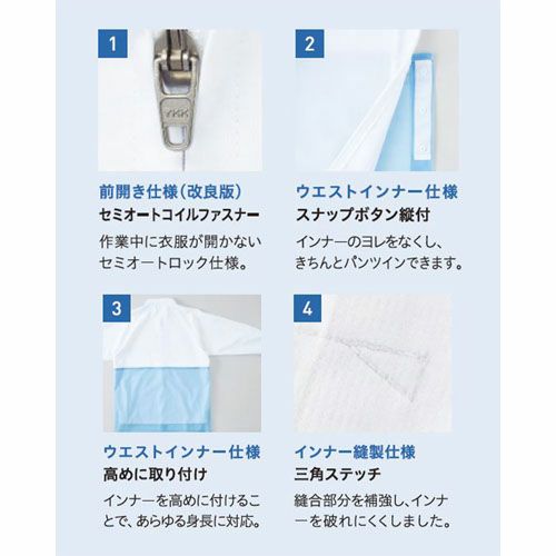 他の画像を見る 食品衛生白衣 衛生衣 作業着 作業服 SZ711 サーヴォ Servo 清潔 衛生 快適 制服 ユニフォーム 食品工場 食品加工 メンズ レディース 高温作業場向け 涼しい 男女兼用ホッピングパンツ 特別価格 ¥ 4,114 税込 高温作業場向け 涼みドライシリーズ肌離れよく、 ベトつきにくい。点タッチ設計で涼やか 素早く汗を拡散させる高い速乾性。凹凸のある組織で、多面的に汗や水分をキャッチ。素早く拡散・乾燥させ、快適な着心地が続きます。鹿の子ニットで安全・安心・快適。異物や体毛落下を抑制しつつつけ心地にも配慮した設計です。気づき仕様の色付きインナーではみ出し防止。はみ出しがひと目でわかる色付きインナーで正しい着用をサポートします。長め袖丈で多くの人の身体にフィット。従来品より袖丈を長くした仕様で、腕の長い方や身体の大きな方も手首まで袖が届く安全設計です。爽やかで清潔感のあるアイスブルーと清潔でクリーンな印象の上質なホワイトの2色展開。 詳細を見る お気に入りに登録する