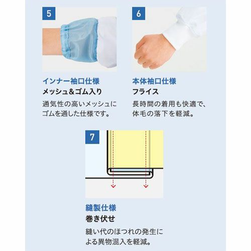 他の画像を見る 白衣 衛生衣 男女兼用 長袖 コート サーヴォ Servo SZ421 食品衛生白衣 上着 作業着 作業服 制服 ユニフォーム 食品 食品加工 給食用 店舗 男性 女性 メンズ レディース 速乾 高温作業 特別価格 ¥ 4,233 税込 高温作業場向け 涼みドライシリーズ肌離れよく、 ベトつきにくい。点タッチ設計で涼やか 素早く汗を拡散させる高い速乾性。凹凸のある組織で、多面的に汗や水分をキャッチ。素早く拡散・乾燥させ、快適な着心地が続きます。鹿の子ニットで安全・安心・快適。異物や体毛落下を抑制しつつつけ心地にも配慮した設計です。気づき仕様の色付きインナーではみ出し防止。はみ出しがひと目でわかる色付きインナーで正しい着用をサポートします。長め袖丈で多くの人の身体にフィット。従来品より袖丈を長くした仕様で、腕の長い方や身体の大きな方も手首まで袖が届く安全設計です。爽やかで清潔感のあるアイスブルーと清潔でクリーンな印象の上質なホワイトの2色展開。 詳細を見る お気に入りに登録する