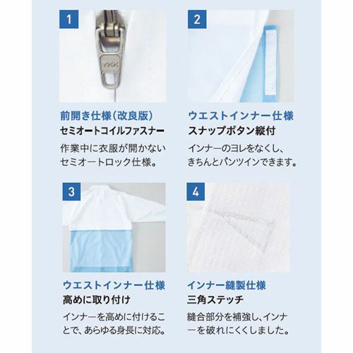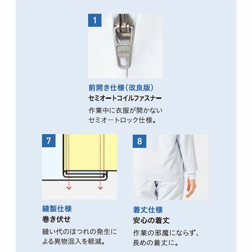 他の画像を見る 白衣 衛生衣 男女兼用 長袖 ジャンパー サーヴォ Servo SZ411 食品衛生白衣 上着 コート 作業着 作業服 制服 ユニフォーム 食品 食品加工 給食用 店舗 男性 女性 メンズ レディース 速乾 高温作業 特別価格 ¥ 4,114 税込 高温作業場向け 涼みドライシリーズ肌離れよく、 ベトつきにくい。点タッチ設計で涼やか 素早く汗を拡散させる高い速乾性。凹凸のある組織で、多面的に汗や水分をキャッチ。素早く拡散・乾燥させ、快適な着心地が続きます。鹿の子ニットで安全・安心・快適。異物や体毛落下を抑制しつつつけ心地にも配慮した設計です。気づき仕様の色付きインナーではみ出し防止。はみ出しがひと目でわかる色付きインナーで正しい着用をサポートします。長め袖丈で多くの人の身体にフィット。従来品より袖丈を長くした仕様で、腕の長い方や身体の大きな方も手首まで袖が届く安全設計です。爽やかで清潔感のあるアイスブルーと清潔でクリーンな印象の上質なホワイトの2色展開。 詳細を見る お気に入りに登録する