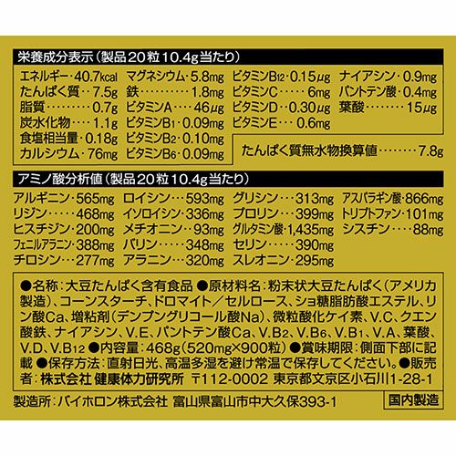 大豆たんぱくには9種の必須アミノ酸がすべて含まれています。アスリートにとってたんぱく質は、カラダづくりの基本となる重要栄養素。タブレットタイプのため、たんぱく質が必要なタイミングで素早く手軽に補給できます。さらに、運動で失われやすい「ビタミン11種」、「ミネラル(カルシウム・鉄)」を配合しました。