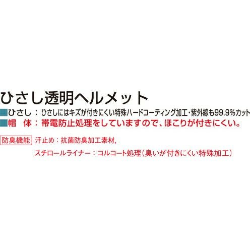他の画像を見る ひさし透明ヘルメット No.370F-OT 通気孔なし トーヨーセーフティ TOYO SAFETY 工事ヘルメット 作業用ヘルメット 工事用 工事 現場 防災 紫外線カット 帯電防止 防臭 飛来落下物対策 墜落 保護 特別価格 ¥ 3,550 税込 ひさしにはキズが付きにくい特殊ハードコーティング加工が施され、紫外線も99.9%カット。帽体は帯電防止処理をしていますので、ほこりが付きにくい! 詳細を見る お気に入りに登録する