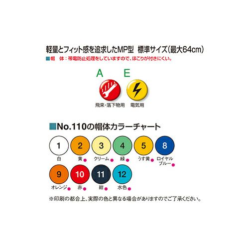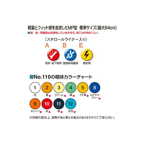 他の画像を見る ヘルメット MP型 No.110-OT ワンタッチ型内装 トーヨーセーフティ TOYO SAFETY つば無し 保護帽 軽量 軽い 工事ヘルメット 作業用ヘルメット 工事用 作業用 工事 現場 防災 帯電防止 特別価格 ¥ 2,120 税込 軽量とフィット感を追求したMP型 10色の豊富なカラーバリエーションで個性が出せます!帯電防止処理をしていますので、帽体にほこりが付きにくいです。 詳細を見る お気に入りに登録する