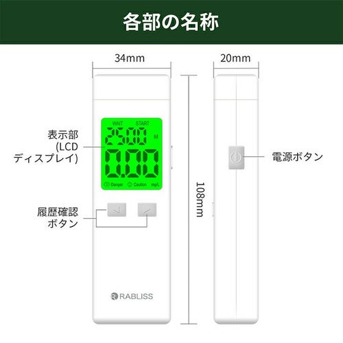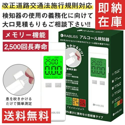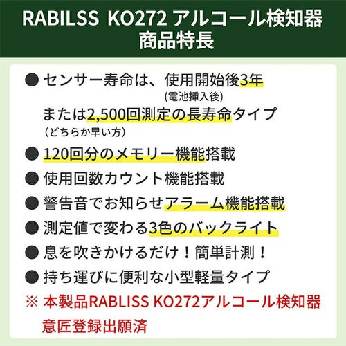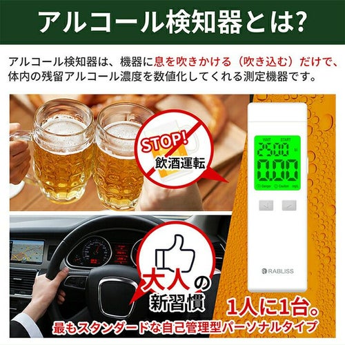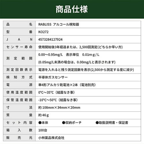 他の画像を見る 即日発送 在庫あり アルコールチェッカー 業務用 小林薬品 RABLISS メモリー機能 2500回 飲酒 検知器 義務化 吹きかけ 警察 濃度 検査 測定 小型 記録 道路交通法 KO272 精度 簡単 軽量 飲酒運転防止 携帯 飲酒チェッカー 特別価格 ¥ 2,640 税込 白ナンバー事業者の飲酒検査義務化に対応。国家公安委員会が定めるアルコール検知器としてご使用いただけます。 道路交通法施行規則が改正され、安全運転管理者業務が拡充されます。「白ナンバー」事業者にも飲酒検査が義務化され、アルコール検知器を用いた酒気帯びの有無の確認が業務に加わります。・令和4年4月1日施行 酒気帯びの有無の確認及び記録の保存・令和4年10月1日施行 アルコール検知器の使用等 在庫切れ 再入荷お知らせ お気に入りに登録する