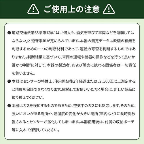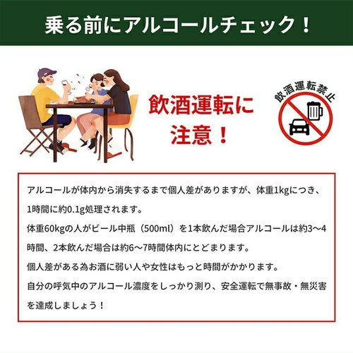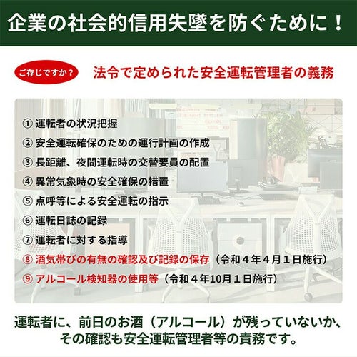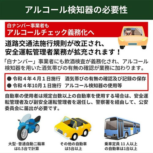 他の画像を見る 即日発送 送料無料 アルコールチェッカー 業務用 小林薬品 RABLISS メモリー機能 2500回 飲酒 検知器 義務化 吹きかけ 警察 濃度 検査 測定 小型 記録 道路交通法 KO272 精度 簡単 軽量 飲酒運転防止 携帯 飲酒チェッカー 特別価格 ¥ 3,520 税込 白ナンバー事業者の飲酒検査義務化に対応。国家公安委員会が定めるアルコール検知器としてご使用いただけます。 道路交通法施行規則が改正され、安全運転管理者業務が拡充されます。「白ナンバー」事業者にも飲酒検査が義務化され、アルコール検知器を用いた酒気帯びの有無の確認が業務に加わります。・令和4年4月1日施行 酒気帯びの有無の確認及び記録の保存・令和4年10月1日施行 アルコール検知器の使用等 在庫切れ 再入荷お知らせ お気に入りに登録する