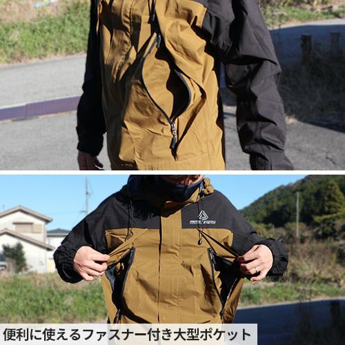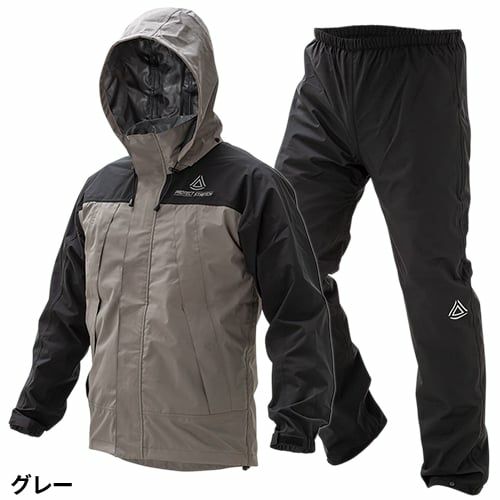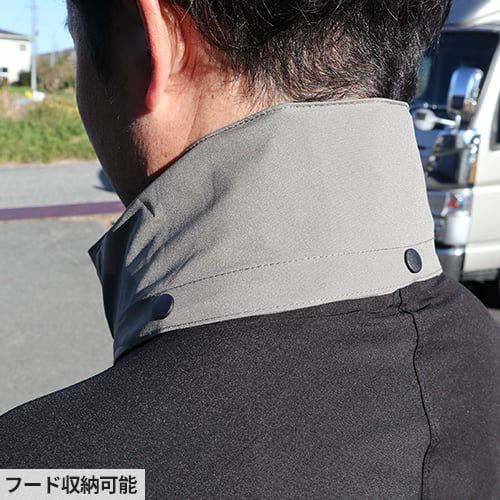 ・上着は水の侵入を防ぐ前たて、収納可能な立体フード(調整ひも付)、裾部分には絞りヒモ付で下からの雨・風の侵入をブロックします。
