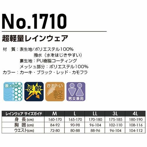 他の画像を見る 合羽 上下セット 喜多 スーパーライトレインウェア 超軽量 No1710 レインウエア 合羽 カッパ合羽 レインウエア 上下セット 特別価格 ¥ 2,750 税込 〜 特別価格 ¥ 税込 常識を覆す「軽さ」を実現した超軽量で、動きやすさを追求したレインウェア! ・従来品に比べ、約50%の軽量化をすることで、合羽特有の重たさによる動きにくさを解消・高い 防水力 耐水圧 10,000mmH2O・縫製部分の裏面には水滴の侵入を防ぐ防水テープ(シームテープ)加工 詳細を見る お気に入りに登録する