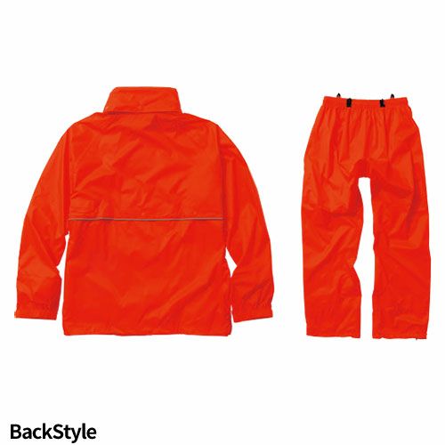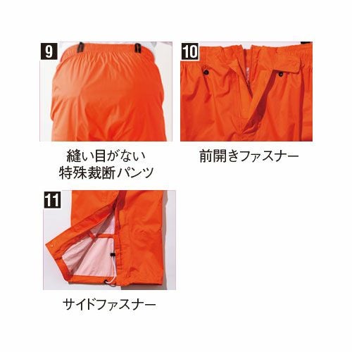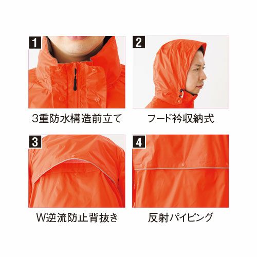 視認性の高い作業用レインスーツ 胸・背中・腕・膝・裾に再帰反射テープを装備し、夜間の安全性を確保リフレクターは360度どの角度からも視認性を確保ダブル前立て右脇ポケットウエストスピンドルパンツ通気口背面ベンチレーションクリアケース:社名や名前などを挟み入れることができる取り外し可能なクリアケースフード:雨から視界を確保し、安全性を高めるクリアメガネ付きヘルメット対応フード。フード高さ調節機能付き裾幅調節:裾のファスナー(三角マチ)により、靴を履いたまま着脱が可能・実用新案登録済みかかと補強:摩擦に強い生地を使用し、地面擦れやすいかかと部分を補強