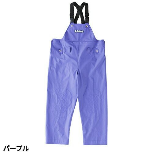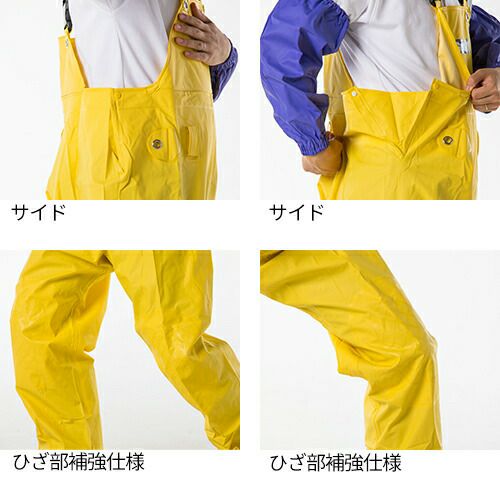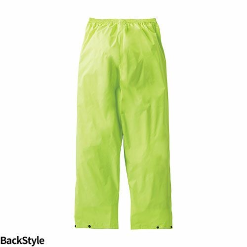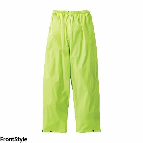 ハイウエスト+裾がズレ上がりにくい利便性を追求した作業に最適のレインパンツ ・しゃがんだ姿勢の作業も安心。腰からの浸水を防ぐハイウエストガード・最大調整幅10cm。股下の長さを3段階調節可能なニーアジャスター・脱ぎ履きを快適にする裾三角マチ仕様+調節テープ