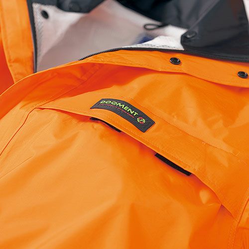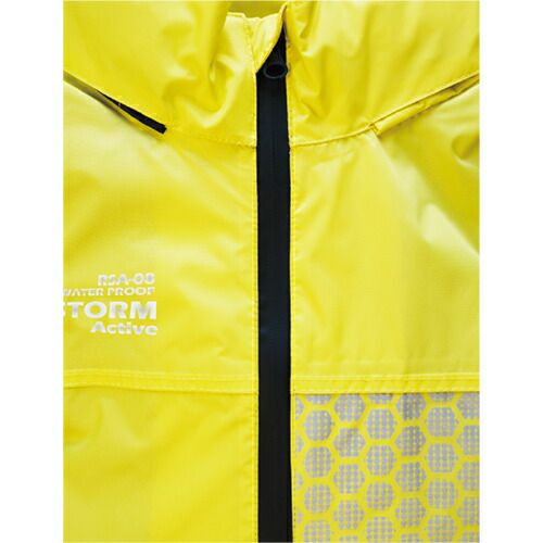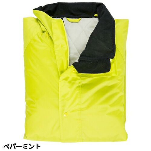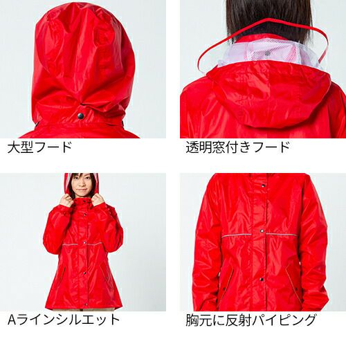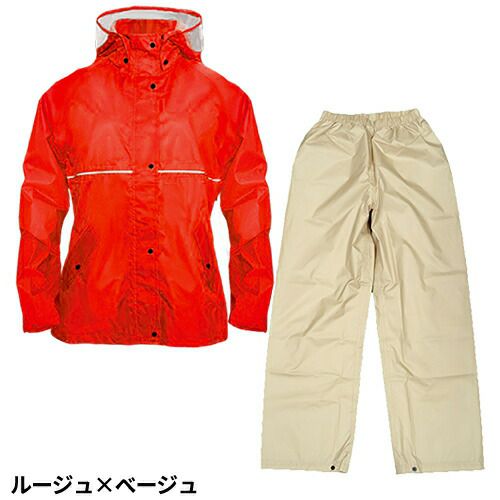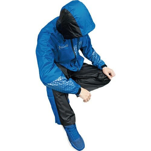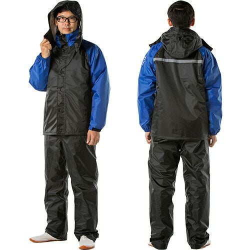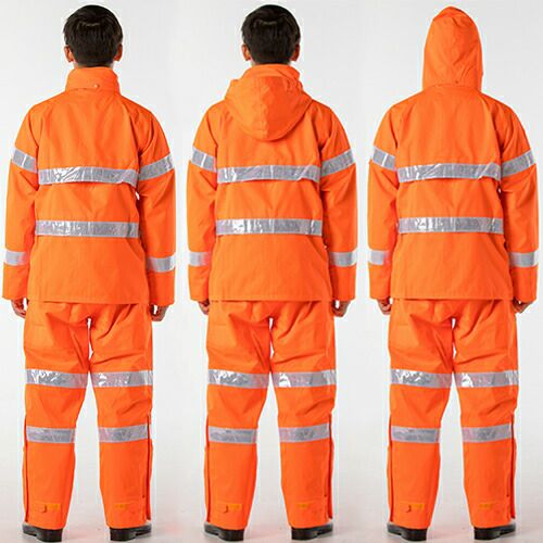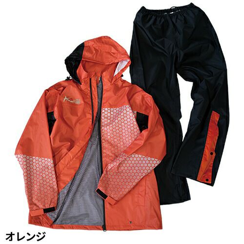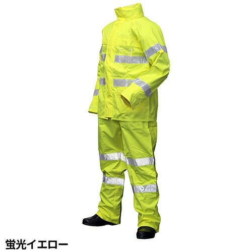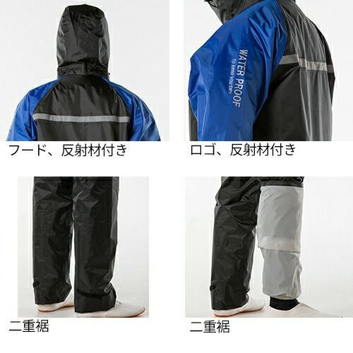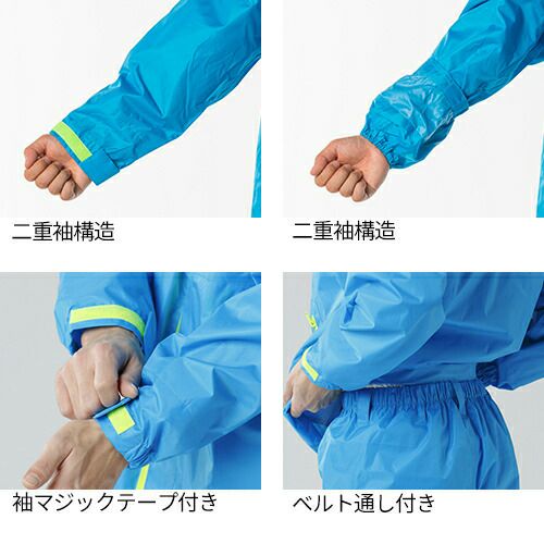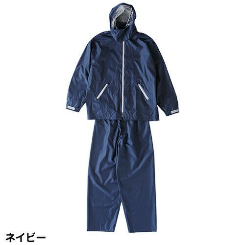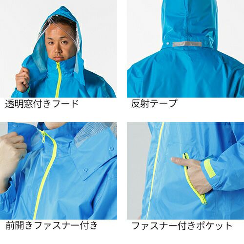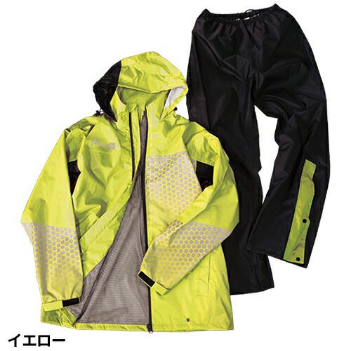 全方向ストレッチ高機能レインスーツ 充実の多機能モデル ■ヘルメット対応・フード収納フード未使用時等はフード固定タブでフード収納可能。襟元はスタンドカラースタイルに。■視認性を高める反射プリントジャケットとパンツに一か所ずつ再帰性反射プリント付き。夜間の視認性を補助■振り向いてもずれないフード左右の顔の動きだけでなく上下の動きにも連動する新設計フード。視界をさえぎらず様々なシーンで安全性と快適性を向上します。ヘルメット未着用時はフード内側の調節コードと後頭部の調節テープをご使用ください。■股下の長さをチェンジ!最大約10cm調節可能体型や作業に合わせて股下の長さをボタンで調節が可能。さらに、裾が上がりにくいパンツ構造で作業をもっと快適に。