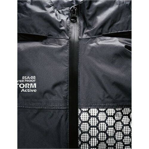水をはじき湿気を逃す高性能に加え360度全方向に伸びるストレッチ性を併せ持つハイスペックな全天候型ウェア ・雨、水の侵入を防ぐ防水仕様・撥水加工で雨、水をはじきやすい・縦横に伸びる、動きやすさを追求した高いストレッチ性・衣服内が蒸れにくい透湿性素材・反射ロゴプリント使いによる高視認性