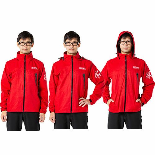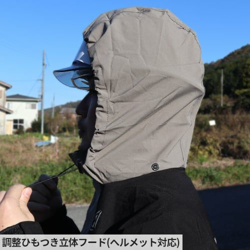 ワンタッチで操作カンタン。フード先端のスイッチを押すとライトが点灯両手をふさがず光を照らせる ・フードLEDライト・リサイクルポリエステル素材・ヘルメット対応ビッグフード・フロント止水ファスナー・手差しポケット・止水ファスナー胸ポケット・背面反射プリント・裏メッシュ