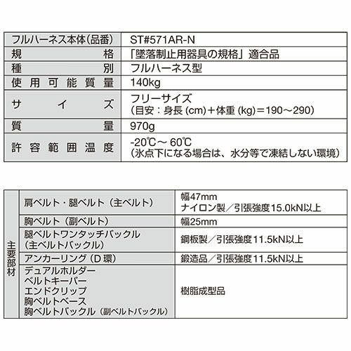 他の画像を見る 安全帯 フルハーネス 新規格 反射フルハーネス 墜落制止用器具 タニザワ 谷沢製作所 ST#571AR-N 単体 匠II 作業ベルトなし 背中X型 水平 フラット フルハーネス安全帯 ハーネス 一般 高所作業 柱上作業 建設工事 軽量 簡単着脱 高視認 特別価格 ¥ 26,840 税込 反射フルハーネス 鉄道工事など夜間の作業に最適! ベルト全部が反射しよく目立つ高い再帰反射性能フリーサイズ(適応範囲の目安は「身長(cm)+体重(kg)」が190~290です。) 詳細を見る お気に入りに登録する