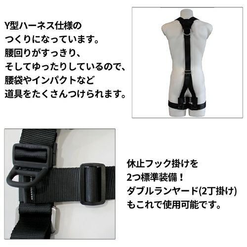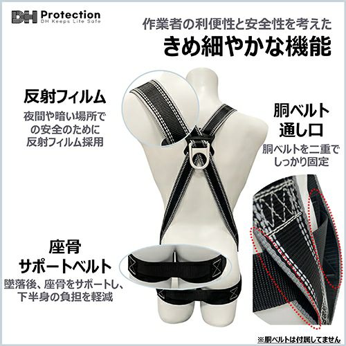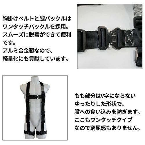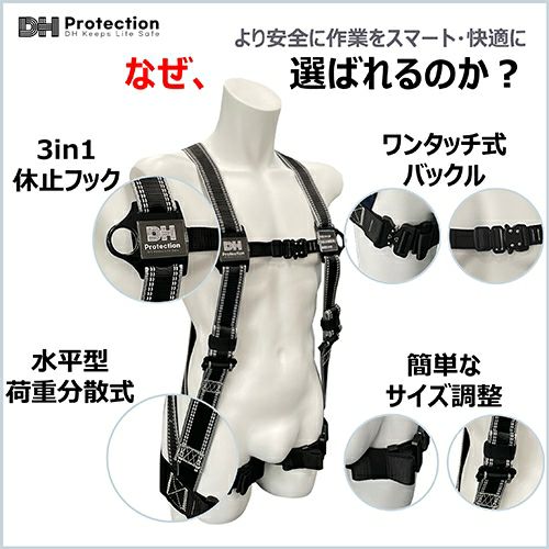 他の画像を見る 安全帯 フルハーネス DH Protection 新規格 墜落制止用器具 V型フルハーネス 130kg対応 パススルー スチール DH02-JP13-P2 DHプロテクション 背中X型 V字 腿ベルト フルハーネス安全帯 ハーネス 一般 高所作業 柱上作業 建設工事 軽量 ブラック 黒 メーカー希望小売価格 ¥ 10,890 特別価格 ¥ 8,140 税込 重さ約900gで130kgまで対応の圧倒的な軽さ! 軽量パススルー式採用で軽量化を実現しました。 カートに入れる お気に入りに登録する