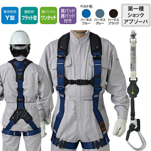 他の画像を見る 安全帯 フルハーネス ツヨロン 藤井電工 シングルランヤード付き 新規格 セット ハーネス 1丁掛け 飛燕ハーネス TH-506 SRリトラ 背中Y型 水平 フラット 墜落制止用器具 巻取式 巻き取り 軽量 一般 高所作業 柱上作業 建設工事 簡単着脱 特別価格 ¥ 41,010 税込 多くの工具類を装備でき、動きやすさも配慮したY型モデル。 POINT1/ 広い道具取付けスペース胸ベルト部に道具取付けスペースを広く確保したY型のフルハーネス。多くの工具類を必要とする作業に最適。POINT2/ 束縛感がない腿部は左右が独立した、束縛感の少ない水平型腿ベルト。道具を多く装備しても動きやすい設計。POINT3/ 身体に合わせてフィットベルトの長さに調節範囲を広くとっているため、夏服・冬服でもぴったり装着が可能。 詳細を見る お気に入りに登録する