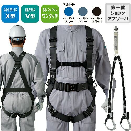 安定感のある背中X型形状とV型腿ベルトを採用 身体を固定する力が強く安定感が魅力のX型の背中形状とV型の腿ベルトを組み合わせました。腿ベルトをぴったりとフィットさせたい方向きのモデル。第1種ショックアブソーバー付きの帯ランヤードD環への接続フック取付タイプ