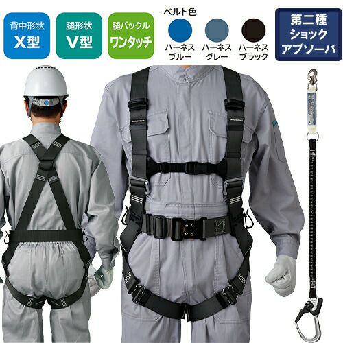 安定感のある背中X型形状とV型腿ベルトを採用 身体を固定する力が強く安定感が魅力のX型の背中形状とV型の腿ベルトを組み合わせました。腿ベルトをぴったりとフィットさせたい方向きのモデル。第2種ショックアブソーバー付きの伸縮ランヤードD環への接続フック取付タイプ