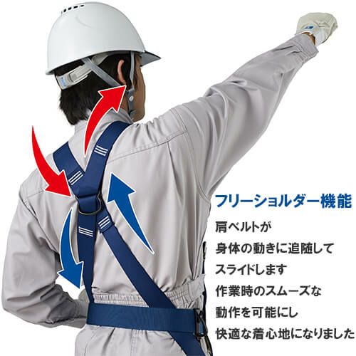 人気の背中Y型形状すっきりと快適な使用感を実現 Y型の背中形状を採用したスタンダードモデルです。すっきりとした見た目と、抜群の動きやすさ。第2種ショックアブソーバー付きの伸縮ランヤードD環への接続フック取付タイプ