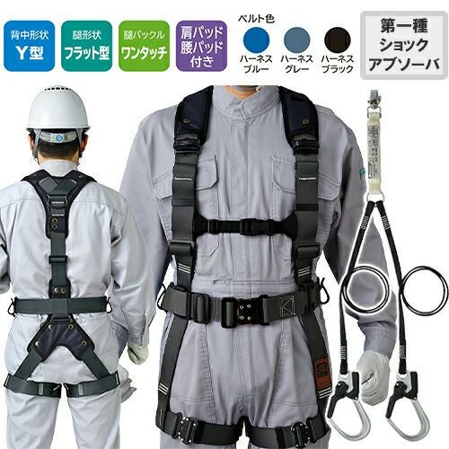 他の画像を見る 安全帯 フルハーネス ダブルランヤード付き タニザワ 新規格 セット ハーネス 2丁掛け 輝II 作業ベルトなし 背中Y型 水平 フラット 墜落制止用器具 伸縮式 軽量 一般 高所作業 柱上作業 建設工事 簡単着脱 ST#574A-N ST#5701-2TRG 特別価格 ¥ 37,490 税込 激しい動きでも耐えられるプロが認めた確かな性能高い性能はそのままにパッドなしのシンプルモデル 耐久性に優れた金属製の胴ベルトアタッチメントを採用、まさにプロ仕様のフルハーネスです。第1種ショックアブソーバー付きの伸縮ランヤードD環への接続フック取付タイプ 詳細を見る お気に入りに登録する