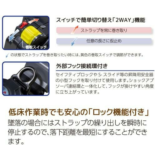 他の画像を見る 安全帯 胴ベルト型 墜落制止用器具 タイタン TITAN サンコー 新規格 REELOCK SII NEO ライト SLN505-130 Mサイズ 胴ベルト型墜落制止用器具 胴ベルト型安全帯 1丁掛け ロック装置付き 巻取式 リール式 ランヤード 巻き取り 軽量 高所作業 落下防止 特別価格 ¥ 20,060 税込 巻取式の代名詞「リーロック」 スイッチでかんたん切替「2WAY」機能。1.任意の長さに仮止め・・・定位置での作業時に2.ストラップを常に巻き取り・・・落下時の距離を最短で制止 詳細を見る お気に入りに登録する
