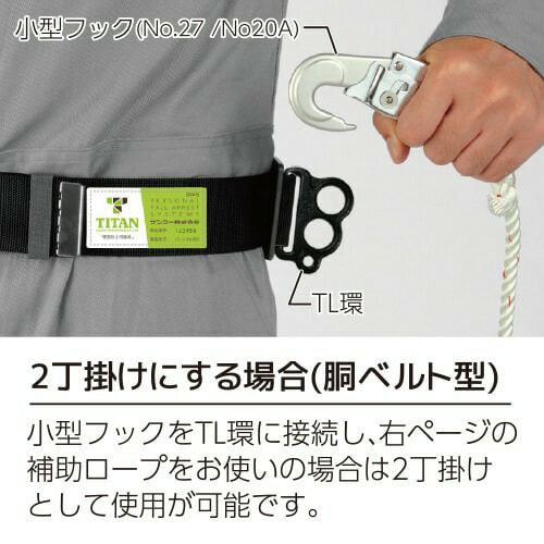 シングルランヤードの胴ベルト型にプラスで2丁掛けにできる メインとなるランヤードが巻取式または、TL(トリプル)環付きの場合に使用可能です。