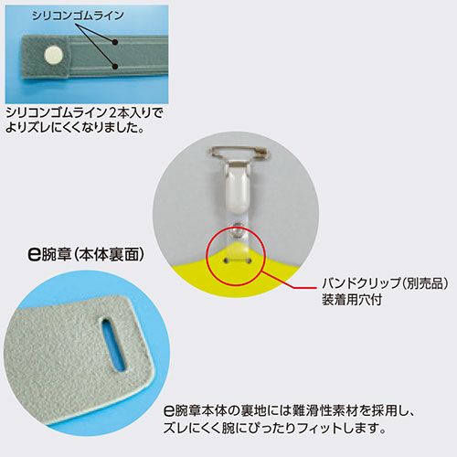 他の画像を見る 【メール便対応】腕章 つくし工房 e腕章専用 別売りバンドクリップ WE-905 腕章 特別価格 ¥ 550 税込 安全ピンなし!腕を通して固定するだけ!!ワンタッチ装着!e腕章 ●体格や着衣を問わず簡単に調整や着脱ができます。●裏地に難滑性素材を採用。締めるだけでズレにくく腕にぴったりとフィットするので突起物等に引っ掛ける心配も殆どありません。●表示部分を最小限にすることで腕周り全体を覆わず装着時のごわつきやムレも軽減します。●腕の細い方や厚手の防寒着を着用した場合でも着脱しやすいようにゴムの長さを2種類ご用意。付け替え可能です。●ズレが気になる方は別売バンドクリップをご使用ください。 カートに入れる お気に入りに登録する