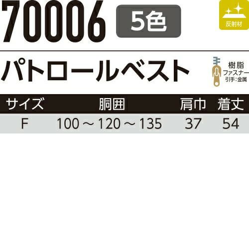 他の画像を見る 安全ベスト 高視認 喜多 安全ベスト(7cm幅) No6000 安全服 反射材付 作業着 作業服 特別価格 ¥ 1,228 税込 反射テープ幅は7cmで、光を強力反射! 名前・会社名・血液型を記入できるタグ付夜間・暗い場所での作業に最適腰回りは、調節可能な両サイドマジックテープ採用メッシュ素材使用で重さも軽く、疲れを軽減 詳細を見る お気に入りに登録する