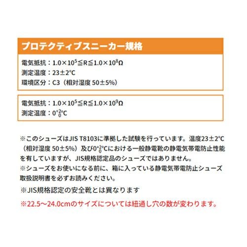 先芯なしの軽量スニーカーに静電機能をプラス 通気性に優れたメッシュ素材を使用した差秋芯なしの軽量シューズに、静電機能を装備して、静電気を嫌う軽作業の現場に対応。足首に印象的な配色を施したシャープなデザインにまとめた男女兼用です。