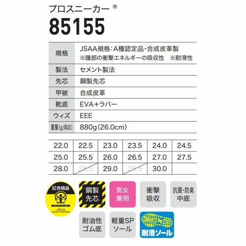 他の画像を見る 安全靴 ジーベック XEBEC セフティシューズ 85155 マジックテープ JSAA規格 プロテクティブスニーカー ミッドカット 鋼製先芯 つま先保護 耐滑 衝撃吸収 スポーティ かっこいい 黒 ブラック 屋外作業 アウトドア 釣り バイク 特別価格 ¥ 4,675 税込 着脱簡単ミッドカットプロスニーカー 三本の面ファスナーと踵のカッティングで脱ぎ履き簡単。クッション性の良いEVAミッドソールで快適な履き心地。アウトソールには滑りにくいゴム配合と意匠で転倒事故から作業者を守ります。プロスニーカーは公益社団法人日本保安用品協会の登録商標です。ジーベックは公益社団法人日本保安用品協会と日本プロテクティブスニーカー協会の会員です。 詳細を見る お気に入りに登録する
