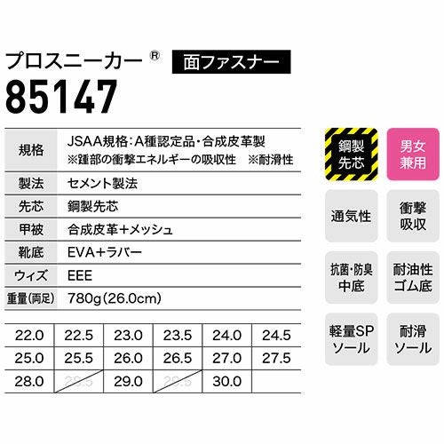 他の画像を見る 安全靴 ジーベック XEBEC マジックテープ プロスニーカー メンズ レディース 85147 JSAA規格 プロテクティブスニーカー 通気性 衝撃吸収 クッション性 抗菌防臭 耐油 軽量 耐滑 おしゃれ 可愛い かっこいい 22.0~30.0cm 特別価格 ¥ 4,150 税込 超快適!通気ソールで人気のモデルにマジックテープタイプが新登場!! 通気性とクッション性に優れた快適仕様に、耐滑ソール・JSAA A種取得の安全性をプラスした人気のモデルにマジックタイプが新登場! 詳細を見る お気に入りに登録する