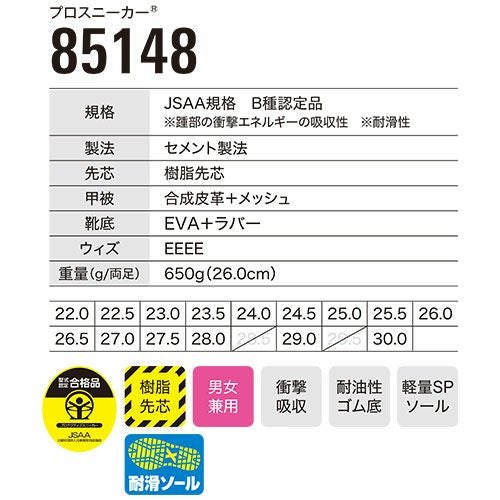 他の画像を見る 安全靴 ジーベック XEBEC プロスニーカー 85148 紐靴 JSAA規格 プロテクティブスニーカー 樹脂先芯 男女兼用 衝撃吸収 耐油 軽量 耐滑 特別価格 ¥ 4,780 税込 耐滑ソール+軽量設計+快適なクッション性を兼ね備えた安心のJSAA型式認定のプロスニーカー 物流倉庫や運送業、建築現場からビルメンテナンスまで幅広く対応するシューズです。最近流行りのワークカジュアルとの組み合わせや、企業納品にも使いやすいスポーツテイストデザインを採用。スポーツテイストの王道なデザインながら、内外非対称配色により、カジュアル要素を演出しています。 詳細を見る お気に入りに登録する