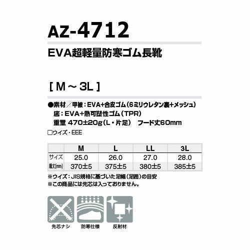 長靴 安全靴 作業靴 AITOZ アイトス EVA超軽量防寒ゴム長靴 AZ-4712 レインブーツ ロングタイプ 防寒 反射材使用 先芯なし おしゃれ かっこいい
