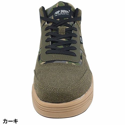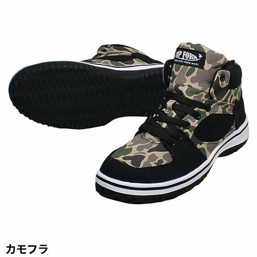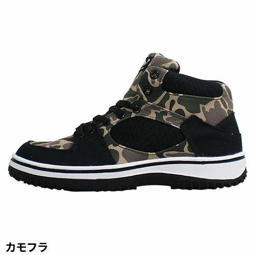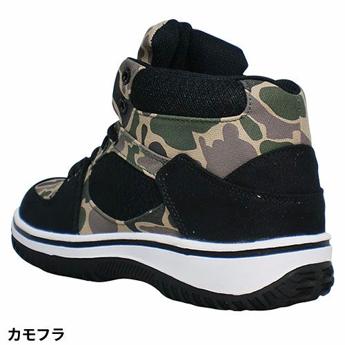 ・履き口は、カモフラ柄の柔らかいクッションを使用で、履きやすい設計・靴底全面ラバーのため、耐滑力抜群&滑りにくい!・アッパー上部分に迷彩柄をワンポイントデザインとして配置・メッシュなしのALL合皮タイプのため、風やホコリなどをシャットアウト!・カカト部分には、視認性の高い反射材採用で夜間作業の安全を確保!・白金ナノ加工された制菌・消臭インソールの生地が菌を撃退!清潔を保ち、消臭効果で足の悪臭消臭 長時間履いても臭いにくい