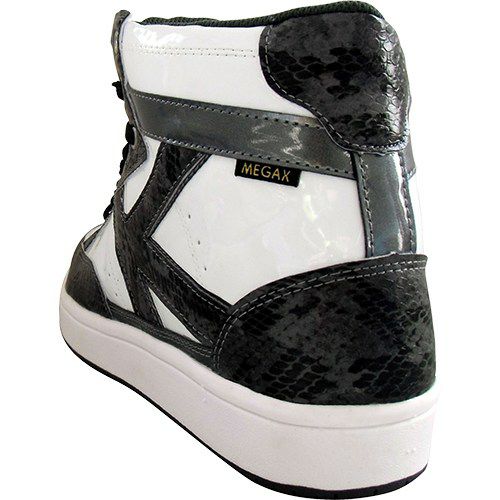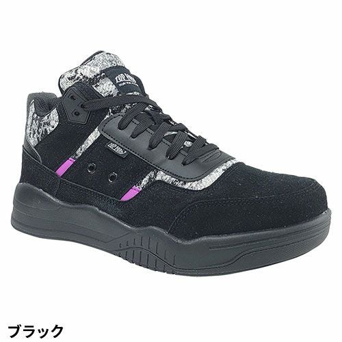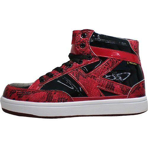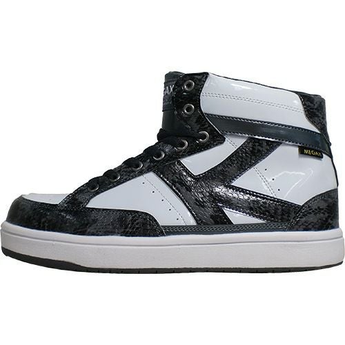 白金ナノ加工された制菌・消臭インソールの生地が菌を撃退!清潔を保ち、消臭効果で足の悪臭消臭 長時間履いても臭いにくい! ヘビ柄アクセントのエナメルハイカットセフティ幅広&甲高の方にオススメのモデルです