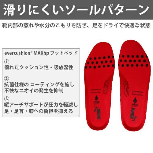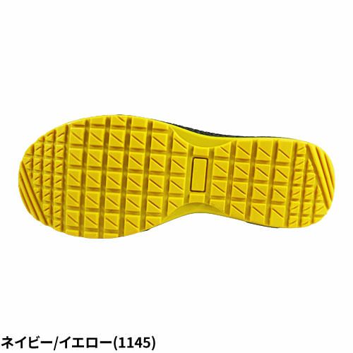 耐滑基準クリア!JIS T8101耐滑性試験をクリアしています。 4つのグリップパターンEVAミッドソール人の動きに配慮した4種類のグリッドパターン。弾力性と耐久性に優れたソール材とのマッチングで耐滑性と運動性、軽量化を実現。・Front wave(フロントウェーブ)踏み切る力をキャッチする高密度グリップ・Direct grip point(ダイレクトグリップポイント)強く踏み込む力を効率よく伝える・Triangle grip(トライアルグリップ)フレキシブルでスムーズなソールの動きを実現・Outside wave(アウトサイドウェーブ)支え踏ん張る動作時に力を引き出す高密度グリップ