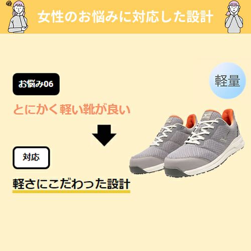 他の画像を見る 安全靴 ミズノ レディース MIZUNO ALMIGHTY FS11L オールマイティ JSAA 作業靴 新作 新商品 2024年 レディース専用 レディース限定 かっこいい かわいい おしゃれ オシャレ 人気 軽量 滑りにくい 蒸れにくい メッシュ素材 軽い 倉庫業 運送業 運輸業 特別価格 ¥ 12,980 税込 女性の足に馴染み、軽くてムレにくいのが特徴。街にとけ込むデザインで、働く女性を足元からサポートします。 履き口のカラーリングが印象的な一足。シンプルで落ち着いたカラーのアッパーは、汚れが目立ちにくく、ワークシーン以外でも見栄えするデザインです。クッション性にすぐれたソール構造を採用。インソールには抗菌防臭加工メッシュを搭載しました。 詳細を見る お気に入りに登録する