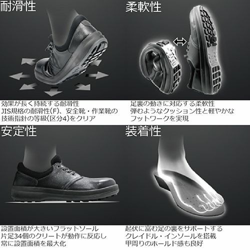 すぐれた耐滑性「JIS T 8101 革製S種[普通作業用]EF合格」*接地面積が大きく安定感に優れる「フラットソール」採用*軽やかなフットワークを実現する、柔軟性に優れる靴底