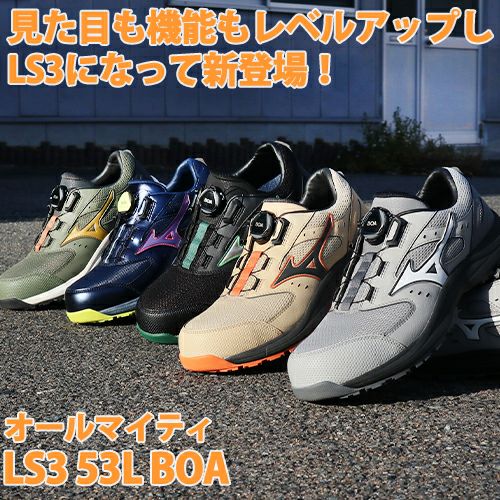 他の画像を見る 安全靴 ミズノ boa ダイヤル式 MIZUNO オールマイティ 新作 MIZUNO ALMIGHTY LS3 53L BOA JSAA規格 2026年 3月末発売予定 限定 メンズ レディース 軽量 JSAA規格 通気性 樹脂先芯 スニーカー 滑りにくい 建築 建設 耐滑 耐油 3E 倉庫業 運送業 運輸業 22.0~30.0cm 特別価格 ¥ 16,280 税込 〜 特別価格 ¥ 税込 LS3シリーズが登場! スリムなシルエットにアップデートした、軽量性・クッション性に優れたLSシリーズの3代目 詳細を見る お気に入りに登録する