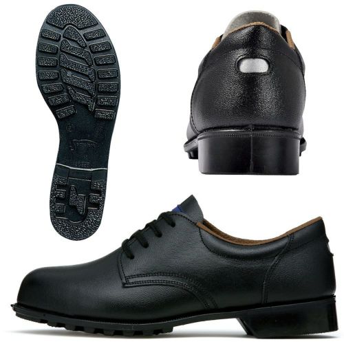 ビジネス仕様デザインで事務現場から作業現場まで 事務作業にも現場作業にも対応できる短靴モデル。熱に強いゴム1層底の「ツヤあり」タイプで、鉄工場や溶接などハードな作業現場にも対応できます。