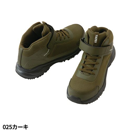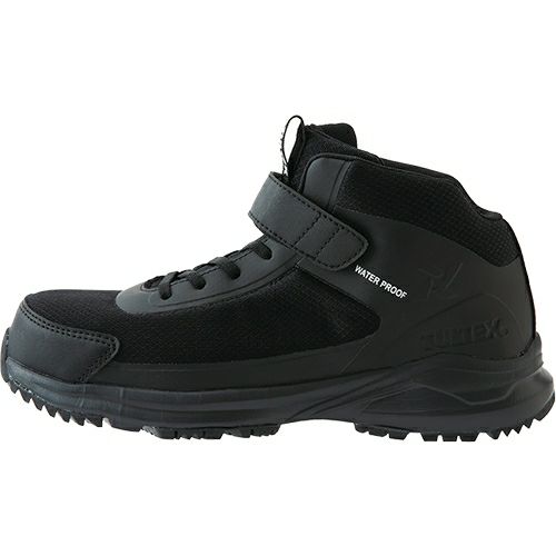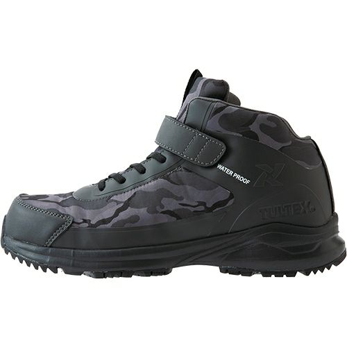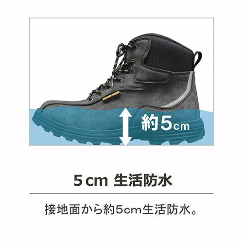 軽度防水仕様で小雨でも気にせず作業可能。ゴム紐タイプの靴紐を採用し着脱の手間も省きます。 ミドルカットと面ファスナー留めでくるぶしまでしっかり保護します。アッパーのタン部分からも水が侵入しにくい構造となっており、現場のお仕事のおともに最適な作業靴となっております。樹脂先芯を採用し、履き心地も軽やかな軽量仕様です。ぜひこの機会にどうぞ!