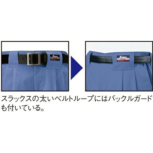 風通しのいいサワークロス使用、JIS規格の帯電防止作業服。ウェア表面からボタンを極力隠してフルフラット化し、スラックスにもバックルガードを装着するなど、対象物にキズを付けないように細かな配慮がされています。ガソリンスタンドや自動車整備などの現場で活躍します。