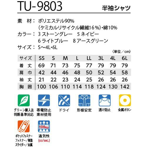 他の画像を見る 作業服 半袖シャツ タカヤ商事 TAKAYA 半袖シャツ TU-9803 作業着 春夏作業着 作業服 半袖 春夏 特別価格 ¥ 4,950 税込 〜 特別価格 ¥ 税込 熱中症予防対策ウェア「爽着シリーズ」!高通気と吸汗速乾を両立させ、夏場の衣服内環境づくりをサポート!! 1.高度なジャパンテクノロジーにより高通気を徹底追及した、夏場の安全服「爽着」シリーズ2.優れた熱放散性と吸汗速乾性で快適な衣服内環境を作り出し、熱中症予防をサポート3.環境への負荷が少ないグリーン購入法判断基準対応品4.左右の胸ポケットはたっぷり収納ダブルポケット仕様5.高品質の日本製素材 詳細を見る お気に入りに登録する